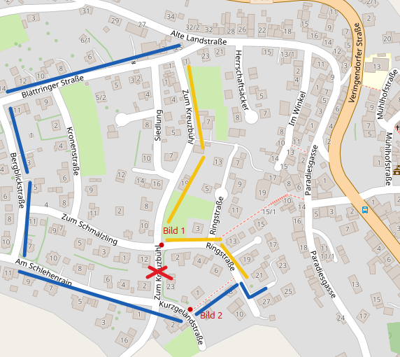 Von der Bundesstraße fährt man wie bisher in die „Alte Landstraße“. Danach mündet man in die „Blättringer Str.“ ein und muss dort aber weiter bis zur „Bergblickstr.“ fahren. Über die „Bergblickstr.“ in die Straße „Am Schlehenrain“ und weiter in die „Kurzgeländstr.“ Dort gibt es eine schmale öffentliche Stichstraße (280 cm breit) die zur Ringstr. führt. Am Ende rechts in die Ringstr. abbiegen.